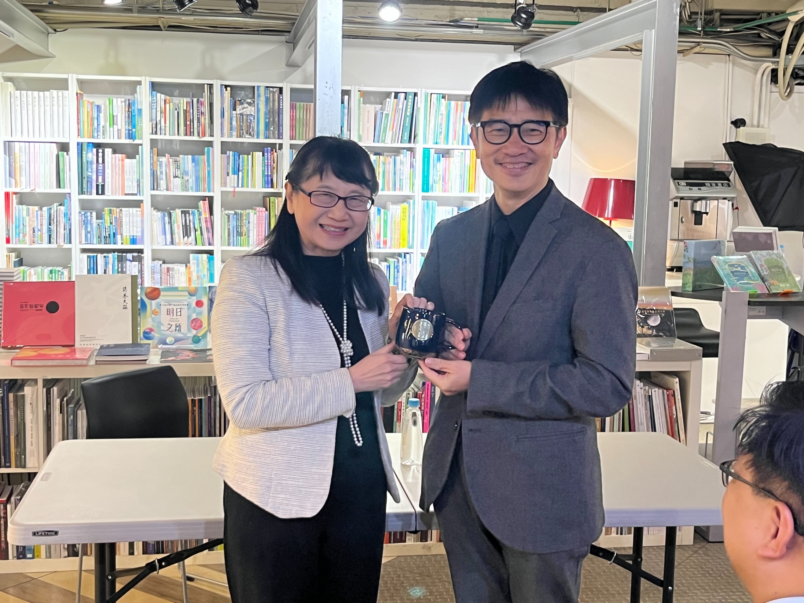 莊慧玲校長(左)致贈紀念品予中央通訊社數位新聞中心羅廣仁主任編輯 |
