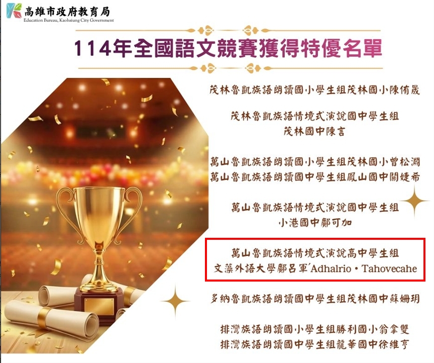 鄺呂軍(左4)奪114年全國語文競賽萬山魯凱語高中組朗讀特優 |