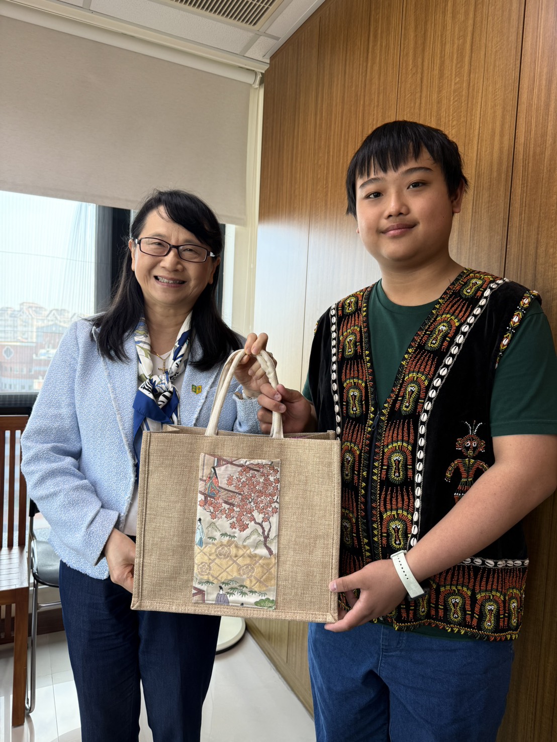 鄺呂軍同學(右)特別致贈莊慧玲校長(左)代表萬山部落的文化禮物,並親自介紹萬山岩雕所蘊含的祖靈信仰與文化意涵。 |