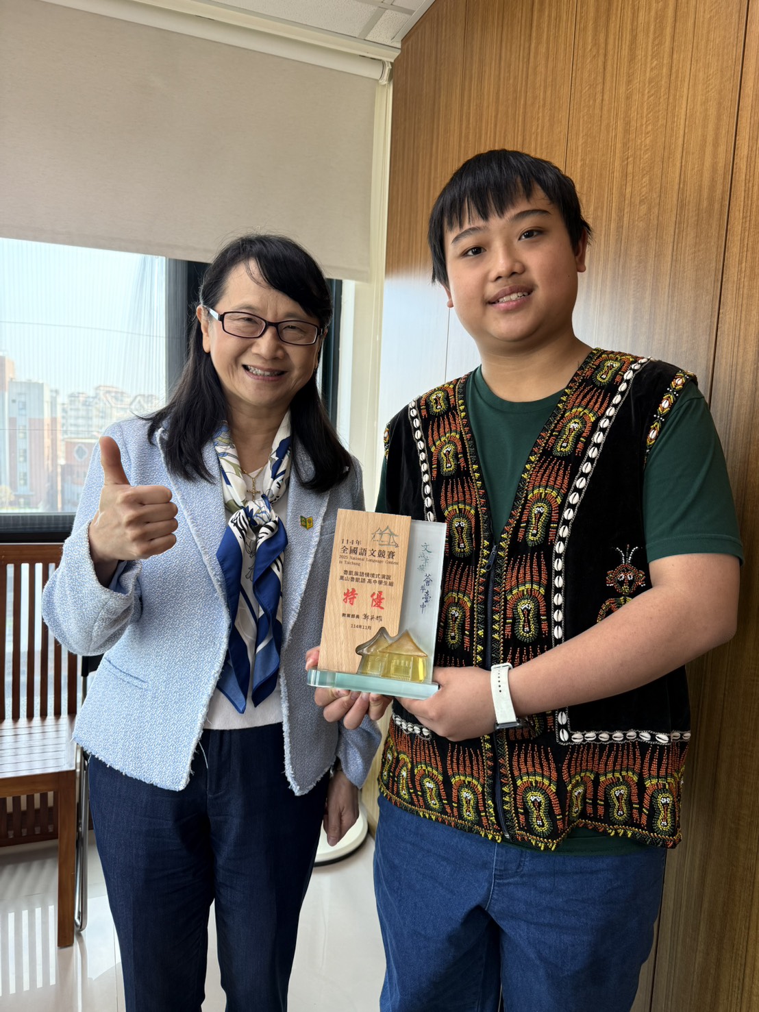 在瀕危族語的守護行動中,青年世代交出亮眼成績單!文藻外語大學五專西班牙語文科二年級學生鄺呂軍('Adhalrio•Tahovecahe),連續二年代表高雄市參加全國語文競賽,於「萬山魯凱族語情境式演說」高中學生組勇奪全國特優。近日他除了榮獲高雄市教育局頒獎表揚外,也獲得文藻外大校長莊慧玲的高度肯定。