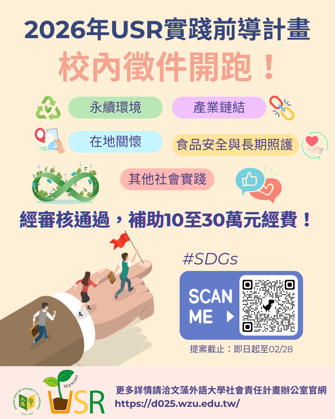 徵件說明:https://d025.wzu.edu.tw/datas/upload/files/112-113/辦公室/表格/文藻USR前導計畫徵件說明_0205.pdf