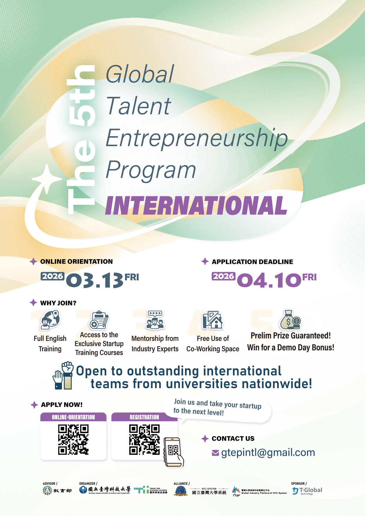 一、為提供在台外籍生培養創新創業知能及優質的創業培訓環境,該校今年接續推出旨揭計畫— The 5th Global Talent Entrepreneurship Program (GTEP),本計畫開放全國大專校院外籍生及本國學生參加,通過初選即得企業贊助之創業獎金,更有機會贏得Demo Day優勝獎金!歡迎對創業有興趣、已創業或準備創業的學生敬請把握機會。