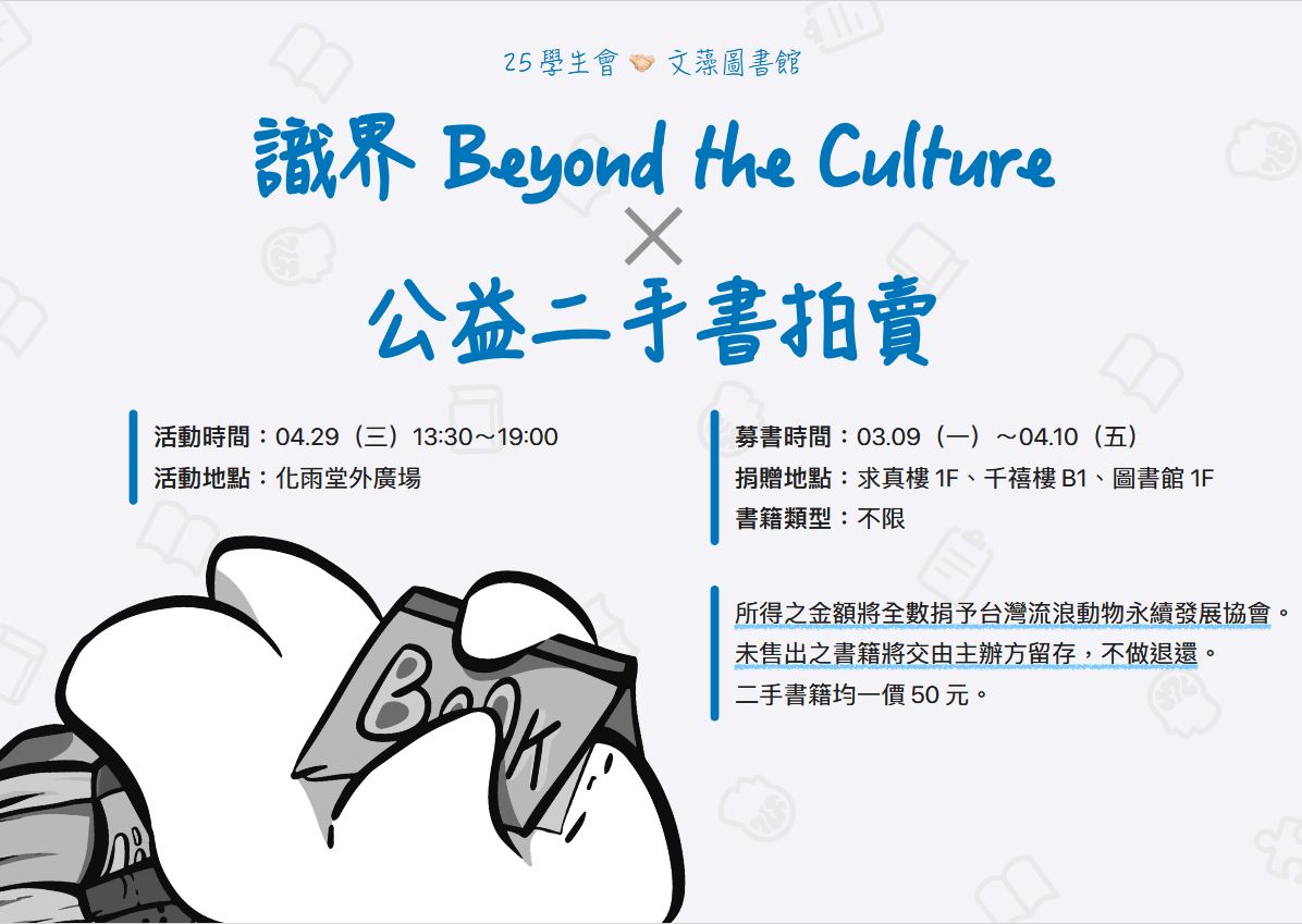 為慶祝4月26日世界智慧財產權日,向所有創作人致敬,尊重智財權;圖書館與第25屆學生會合作舉辦「文化週市集X公益二手書拍賣」活動,自3月9日起至4月10日止募捐二手書,歡迎大家捐書做公益。