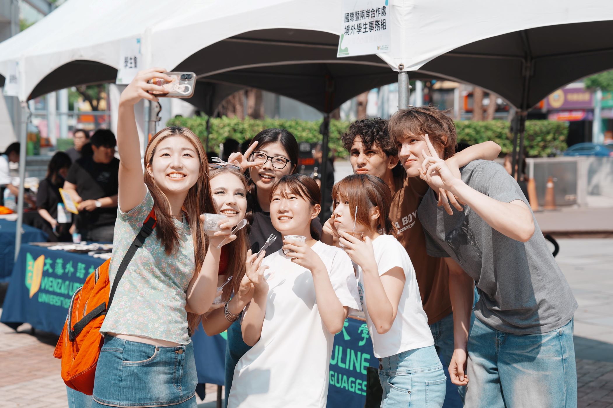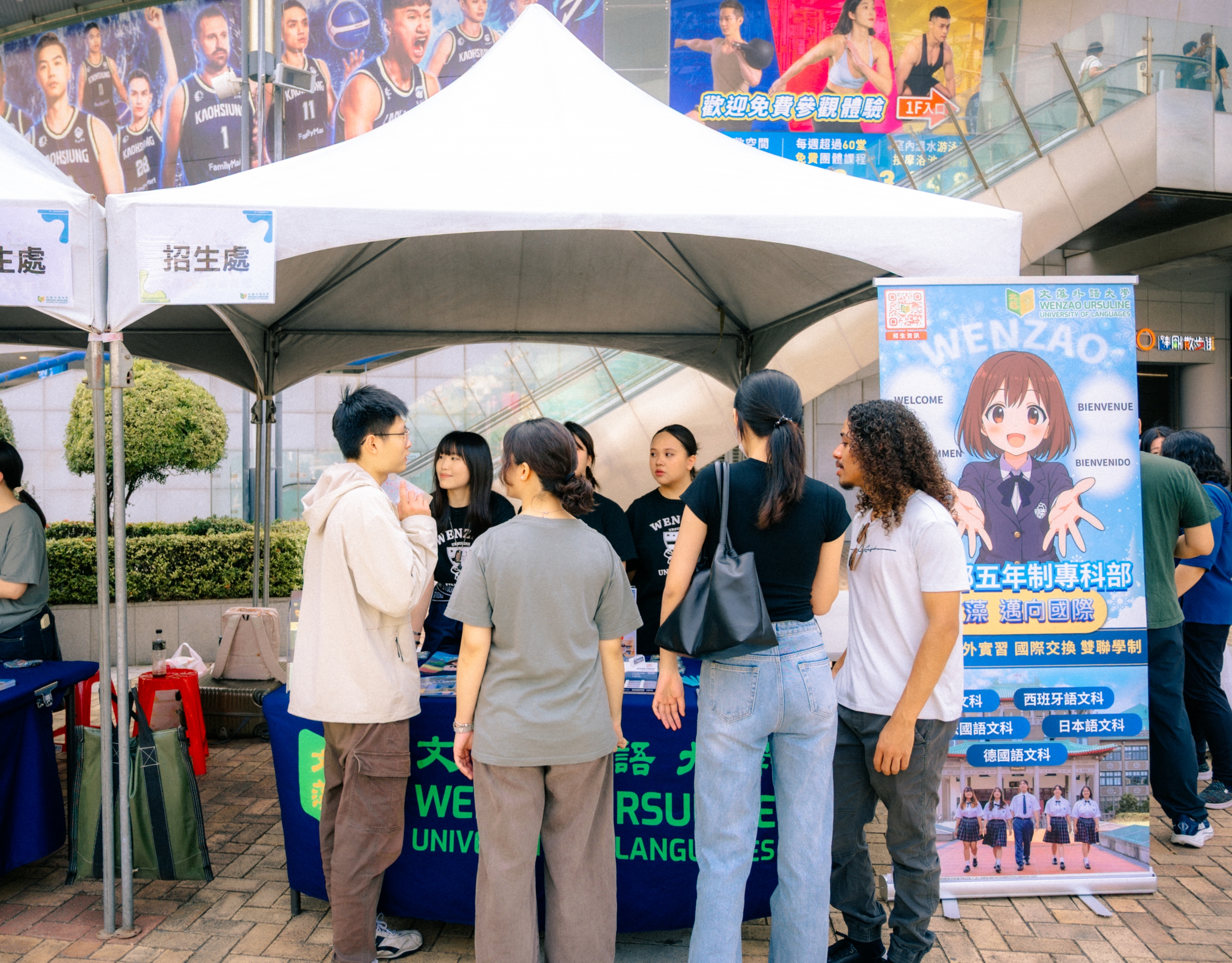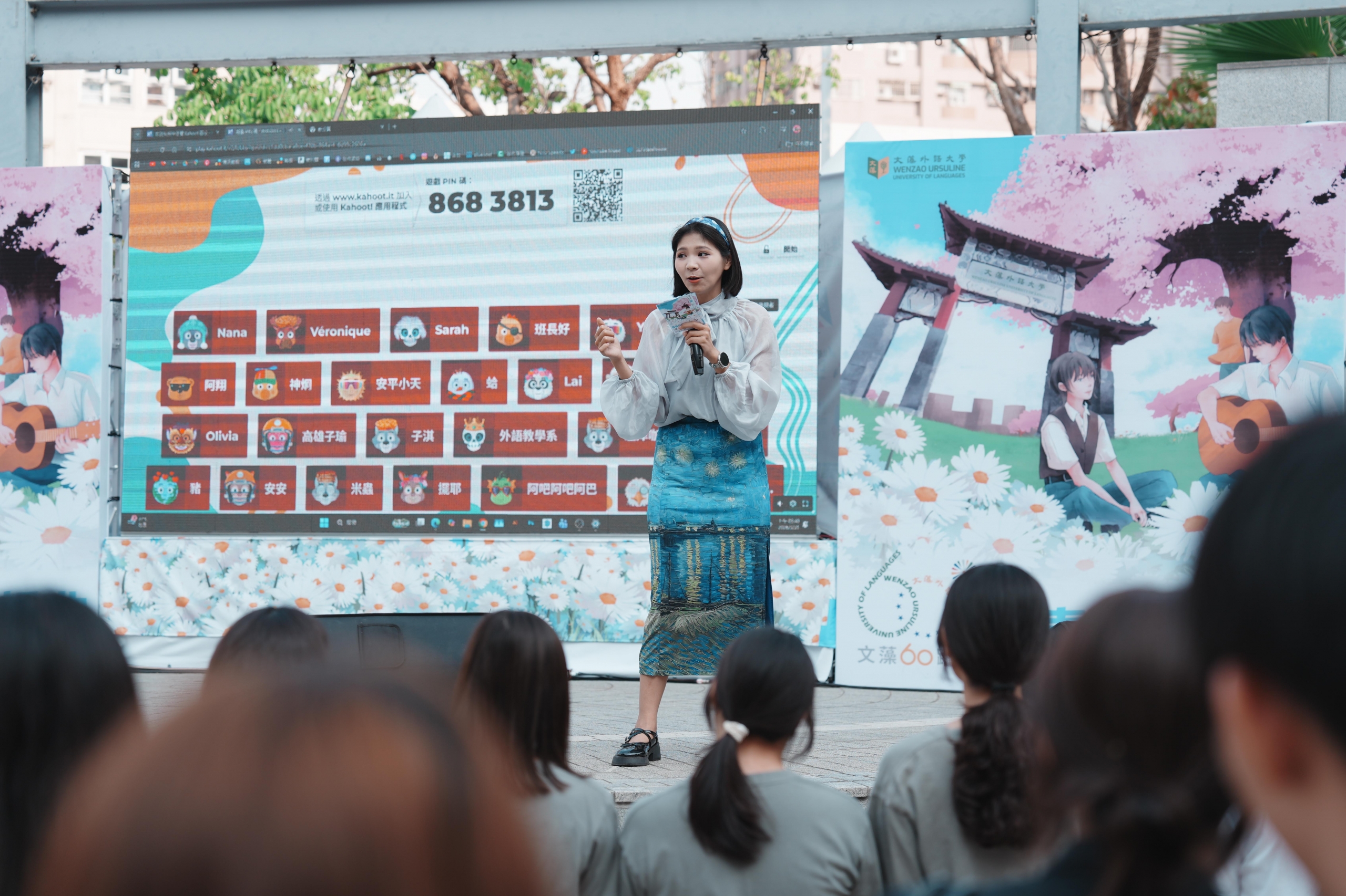 除了精彩舞台表演,現場也規劃多項互動體驗,包含Kahoot!即時問答遊戲與主題攤位,吸引民眾踴躍參與。其中,文藻的國際暨兩岸合作處特別設計與境外生互動的趣味挑戰,民眾不僅能體驗各國文化,還有機會獲得冰淇淋等小禮物,現場歡樂聲不斷。此外,現場也安排招生專區與學生會展區,同步介紹文藻多國語學習環境與校園生活,增加與民眾互動的機會。