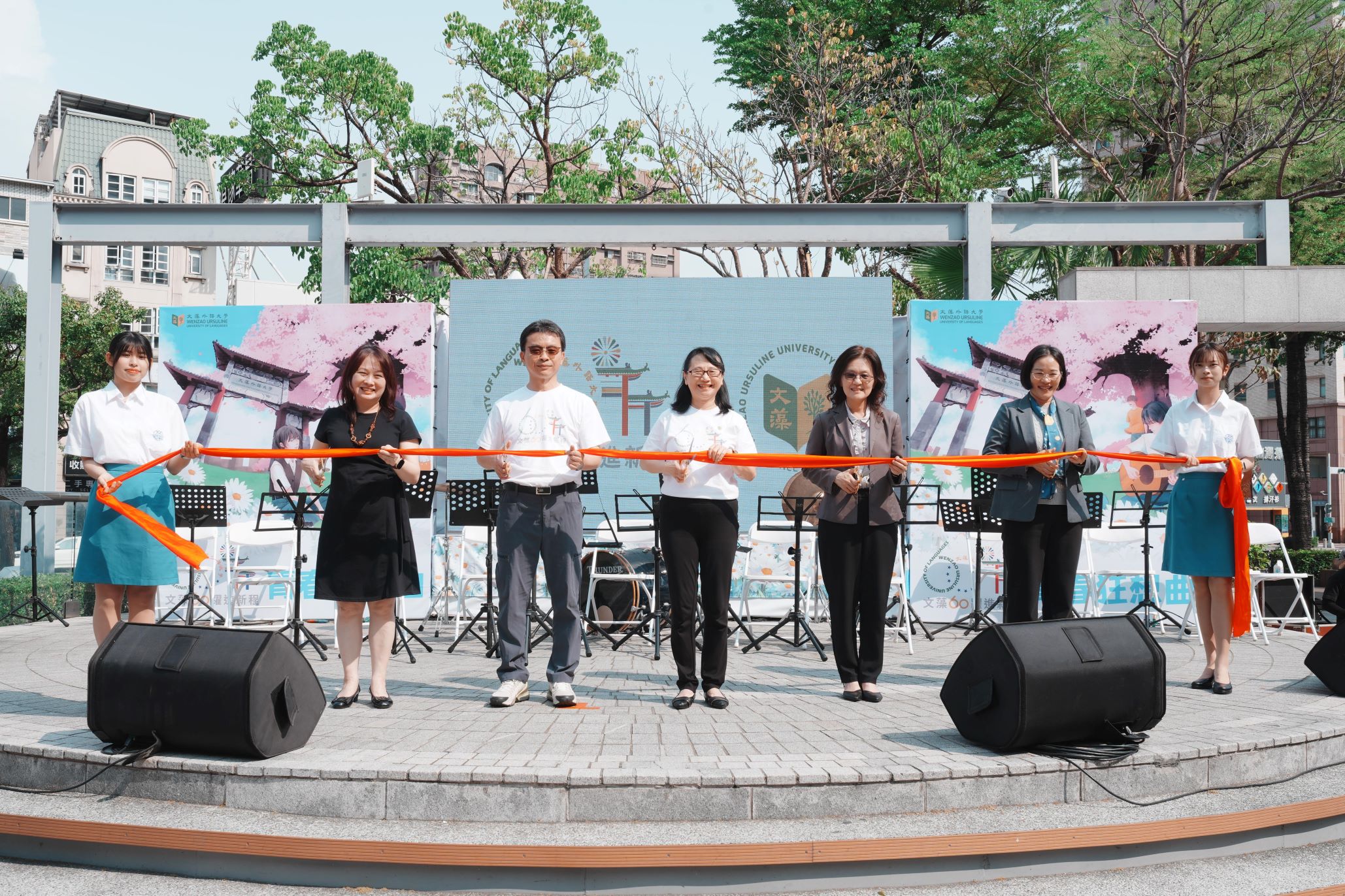 文藻外語大學迎接創校60周年校慶,於巨蛋廣場前舉辦社團成果展。活動由莊慧玲校長(中)、林耀堂副校長(左三)率領一級主管共同進行剪綵儀式,為慶祝活動揭開序幕。相片攝影/公關室