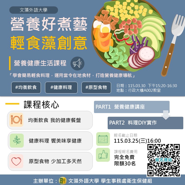 學務處衛生保健組將於115年03月30日(一) 舉辦1場營養好煮藝~輕食藻創意健康促進講座與DIY活動。