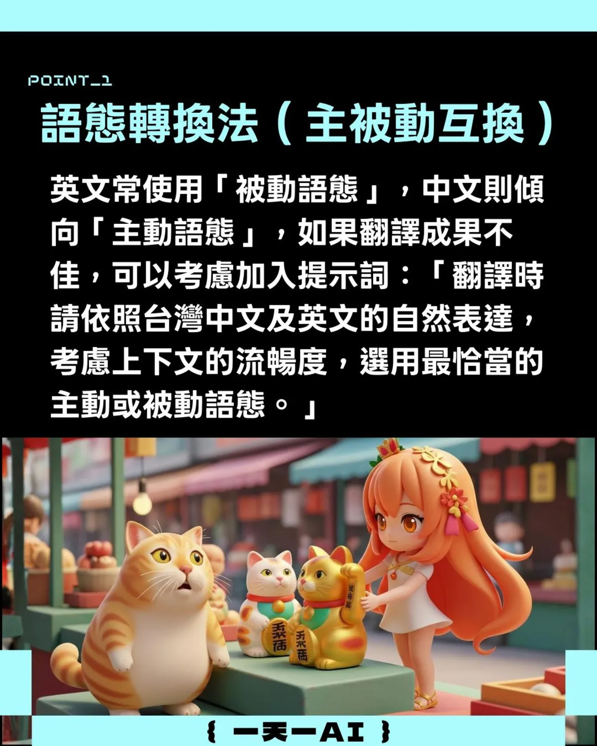 英文常使用「被動語態」,中文則傾向「主動語態」,如果翻譯成果不佳,可以考慮加入提示詞:「 翻譯時請依照台灣中文及英文的自然表達,考慮上下文的流暢度,選用最恰當的主動或被動語態。 」