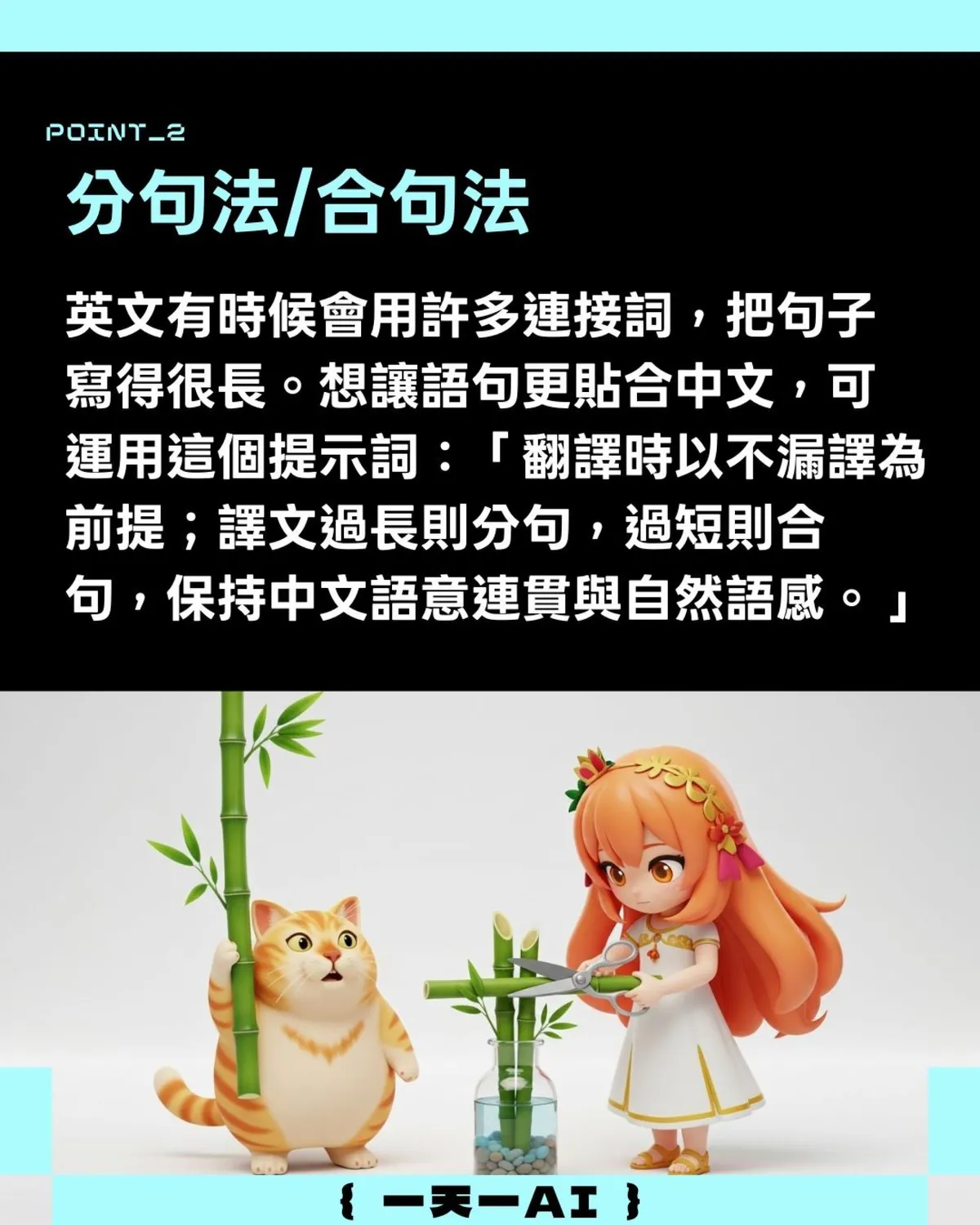 英文有時候會用許多連接詞,把句子寫得很長。想要讓語句更貼合中文,可以運用這個提示詞:「 翻譯時以不漏譯為前提;譯文過長則分句,過短則合句,並保持中文語意連貫與自然語感。 」