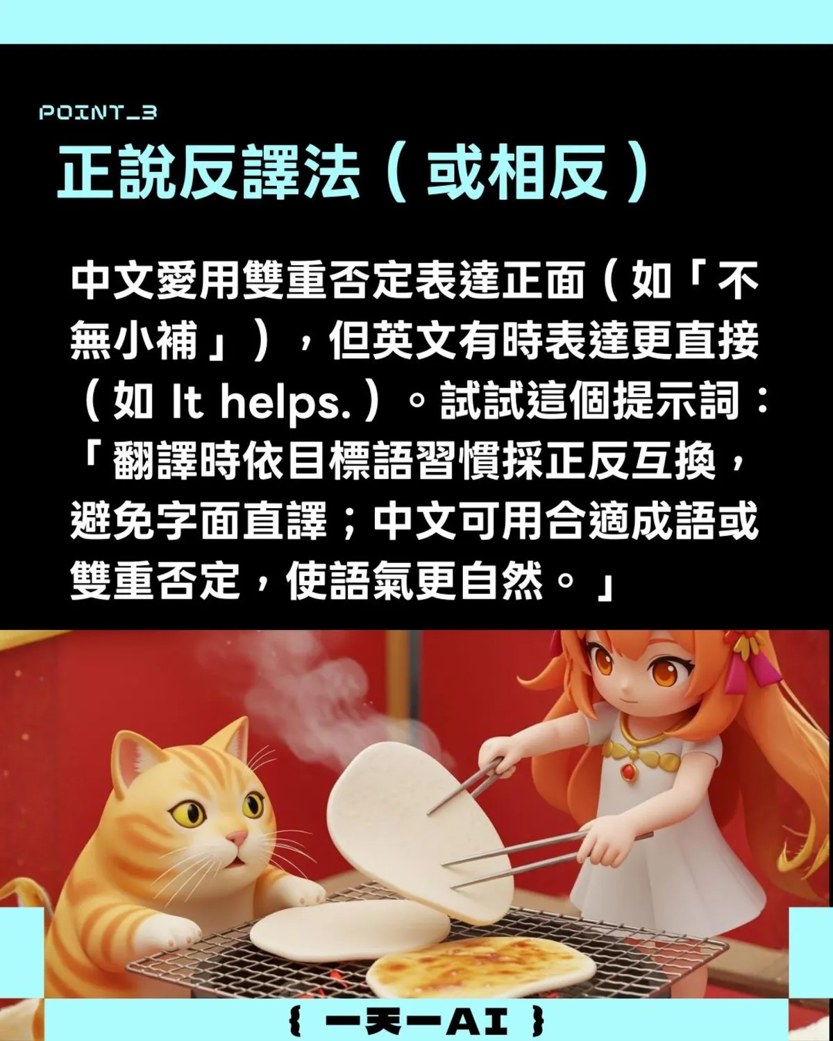 這是語言和文化有意思的地方。中文愛用雙重否定表達正面(如「不無小補」),但英文有時表達更直接(如 It helps.)。試試這個提示詞:「 翻譯時依目標語習慣採正反互換,避免字面直譯;中文可用合適成語或雙重否定,使語氣更自然。 」