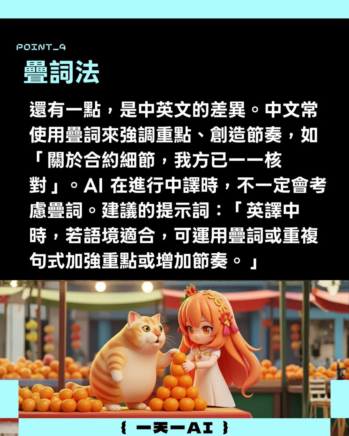 還有一點,是中英文的差異。中文常使用疊詞來強調重點、創造節奏,如「關於合約細節,我方已一一核對」。AI 在進行中譯時,不一定會考慮疊詞。建議的提示詞:「英譯中時,若語境適合,可運用疊詞或重複句式加強重點或增加節奏。」