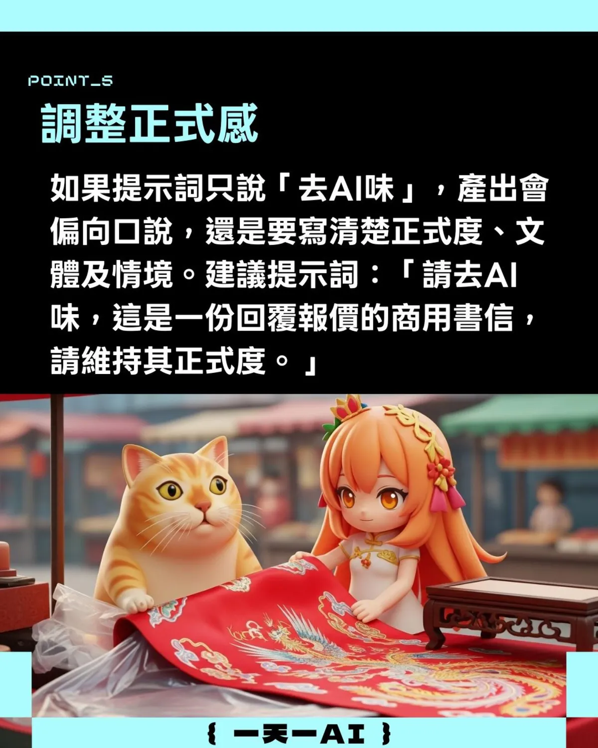 如果提示詞只說「去AI味」,產出會偏向口說,還是要寫清楚正式度、文體及情境。建議提示詞:「請去AI味,這是一份回覆報價的商用書信,請維持其正式度。」