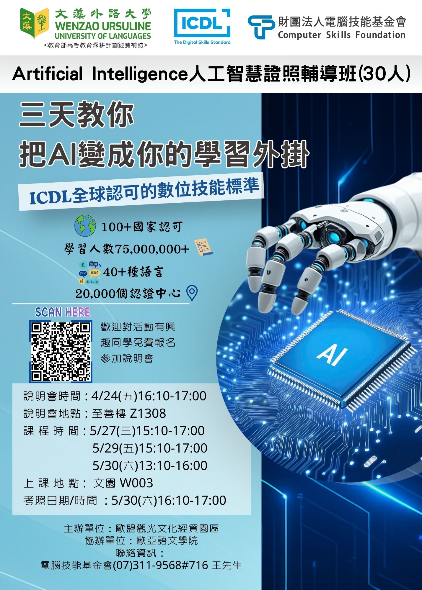 歐盟園區舉辦「ICDL Artificial Intelligence 人工智慧證照輔導說明會」(4/24、16:10~17:00)_歡迎有興趣的同學報名參加!