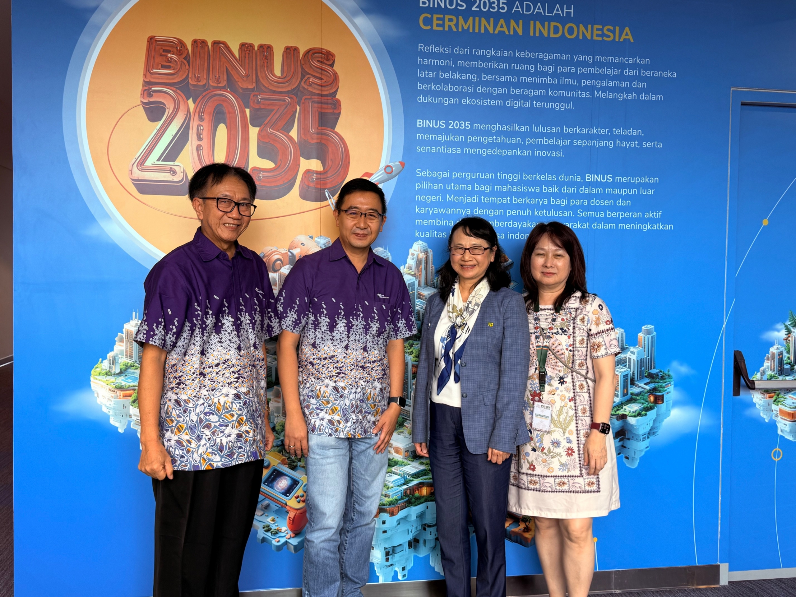 拜訪印尼建國大學(BINUS)互贈禮品後合影,左一為該校Campus Director Prof. Chang,左二為該校集團總裁Stephen Santoso (2026/3/6) |
