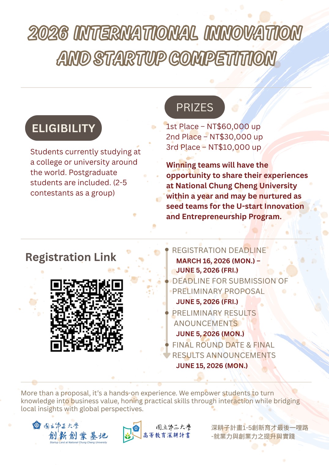 【產官學組】【轉知】國立中正大學創新創業基地辦理「2026國際創新創業競賽」,歡迎學生(含研究生)踴躍報名參與。