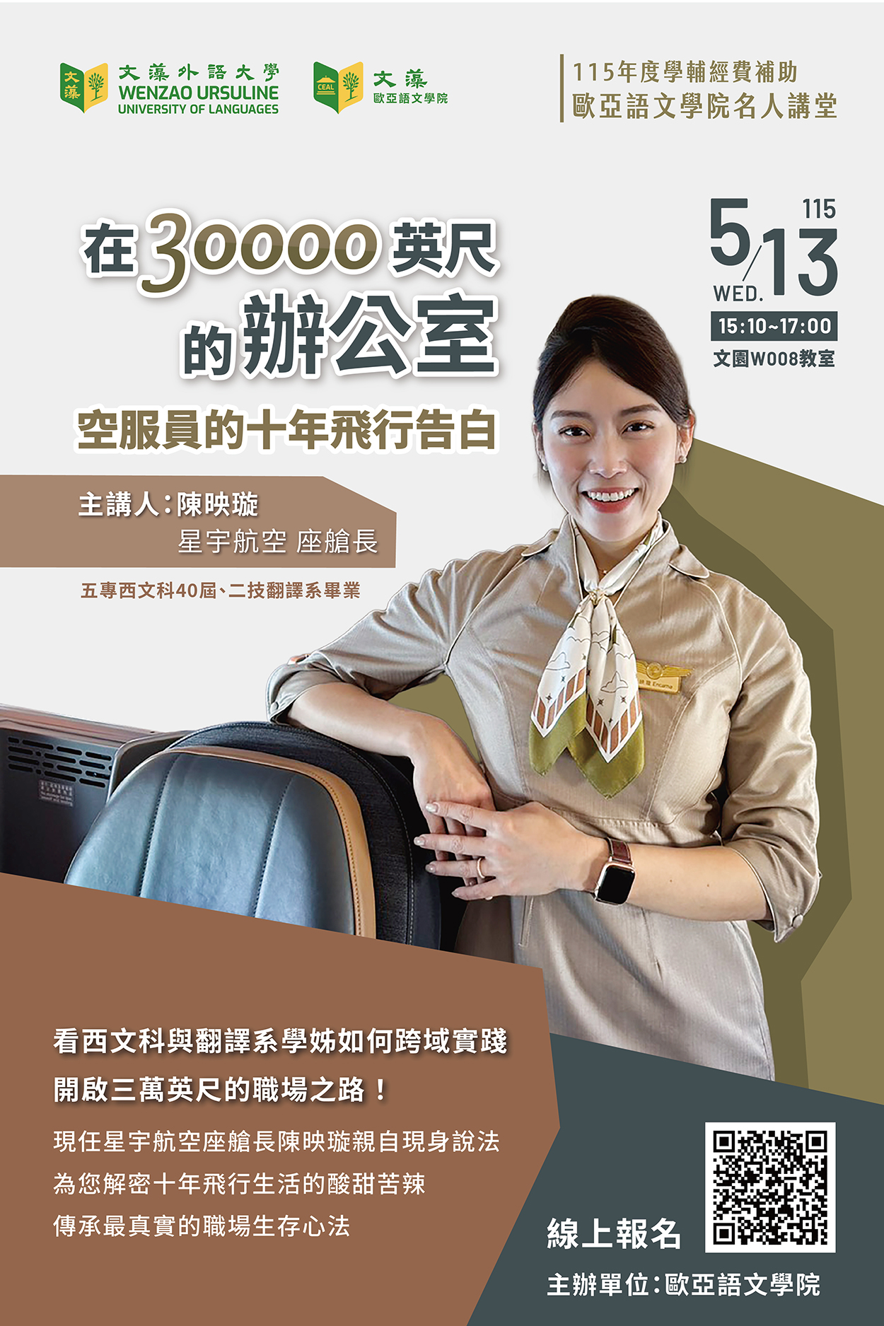 從文藻西文科到翻譯系,學姊如何將語文優勢轉化為航空業的專業競爭力? 在長達十年的飛行生涯中,又有什麼不可不知的酸甜苦辣? 無論您是對航空業感興趣,或是想聽聽學姊的職涯發展心路歷程,這場講座絕對不能錯過!
