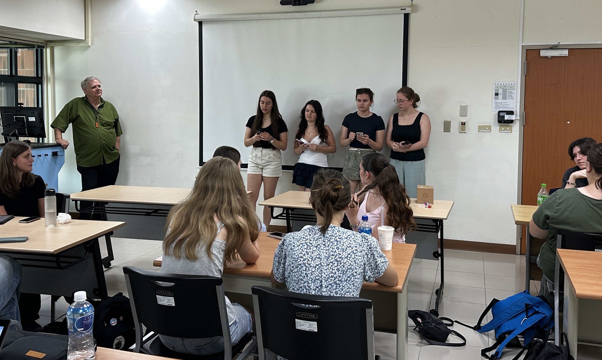 德國姊妹校學生參與德文系李克揚(Christian Richter)教授(左)課程,體驗文藻課堂氛圍。 |