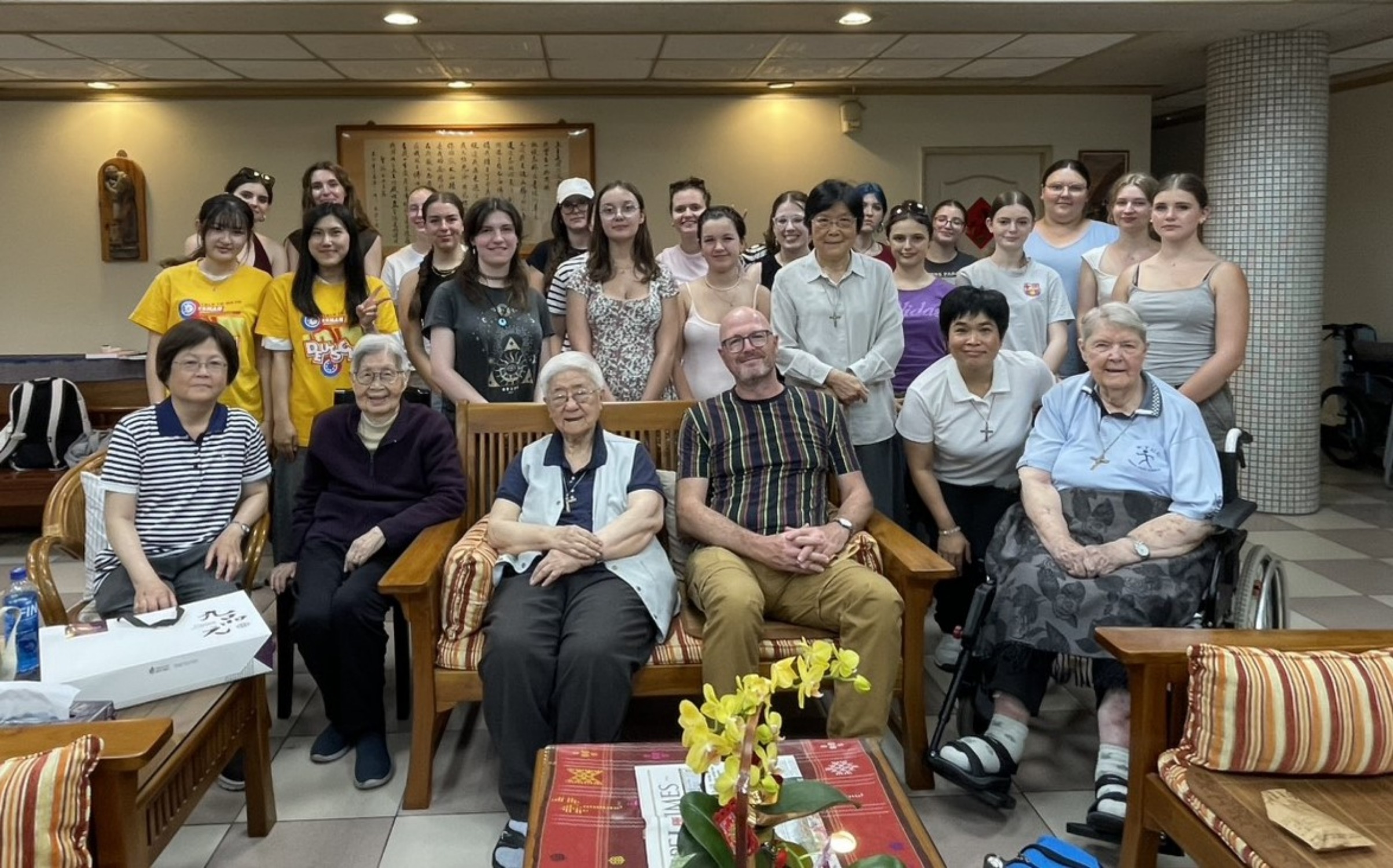 文藻圖書館張守慧館長(前排左一)帶領德國姊妹校師生拜會聖吳甦樂會修女,雙方互動熱絡並合影留念。 |
