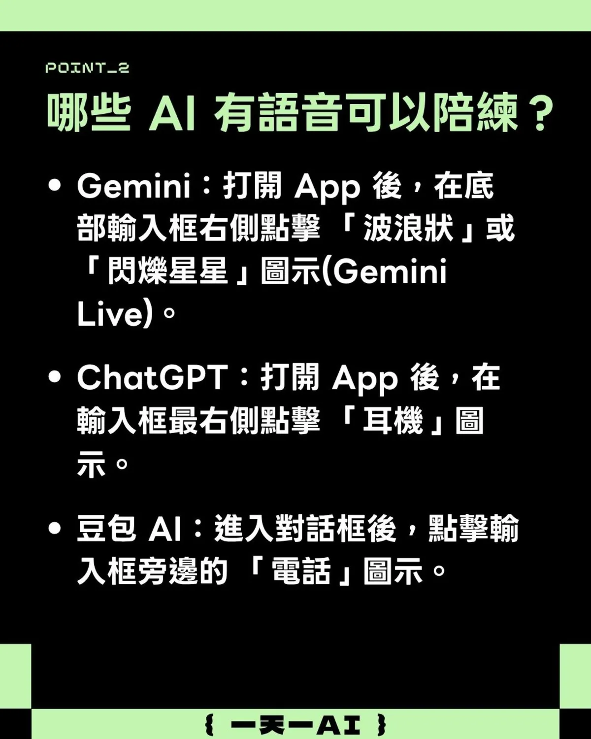 Gemini:打開App後,在底部輸入框右側點擊 「波浪狀」或「閃爍星星」圖示(Gemini Live)。