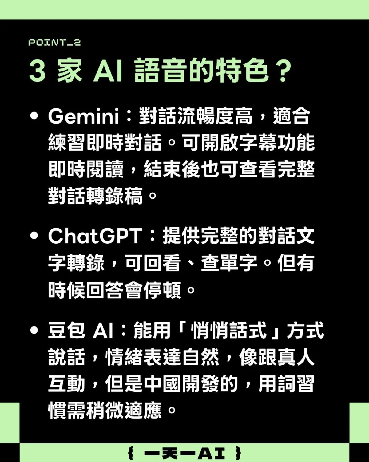 ChatGPT:提供完整的對話文字轉錄,可回看、查單字。但有時候回答會停頓。依賴指令才給下一句,但有提供文字轉錄的介面閱讀,適合之後想精進文法與單字的人。
