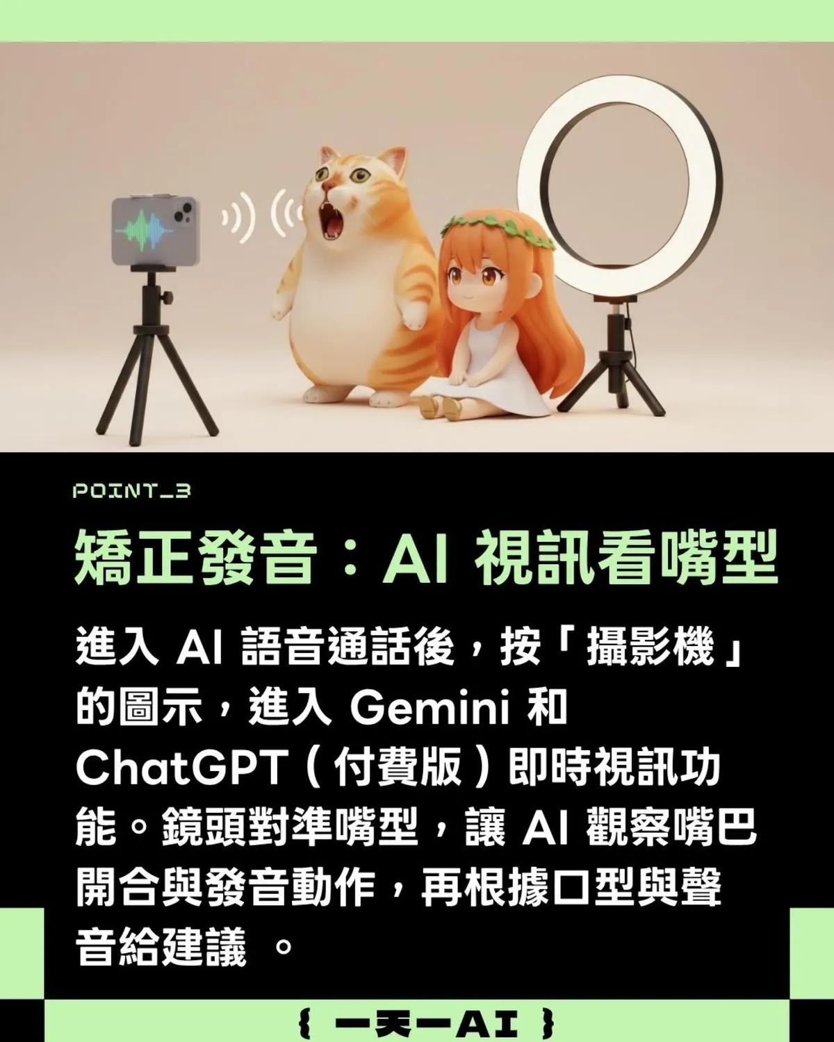 進入語音後按攝影機的圖示,可以進到Gemini和ChatGPT(付費版)即時視訊功能。把鏡頭對準嘴型,讓AI觀察嘴巴開合與發音動作,再根據口型與聲音給予修正建議 。