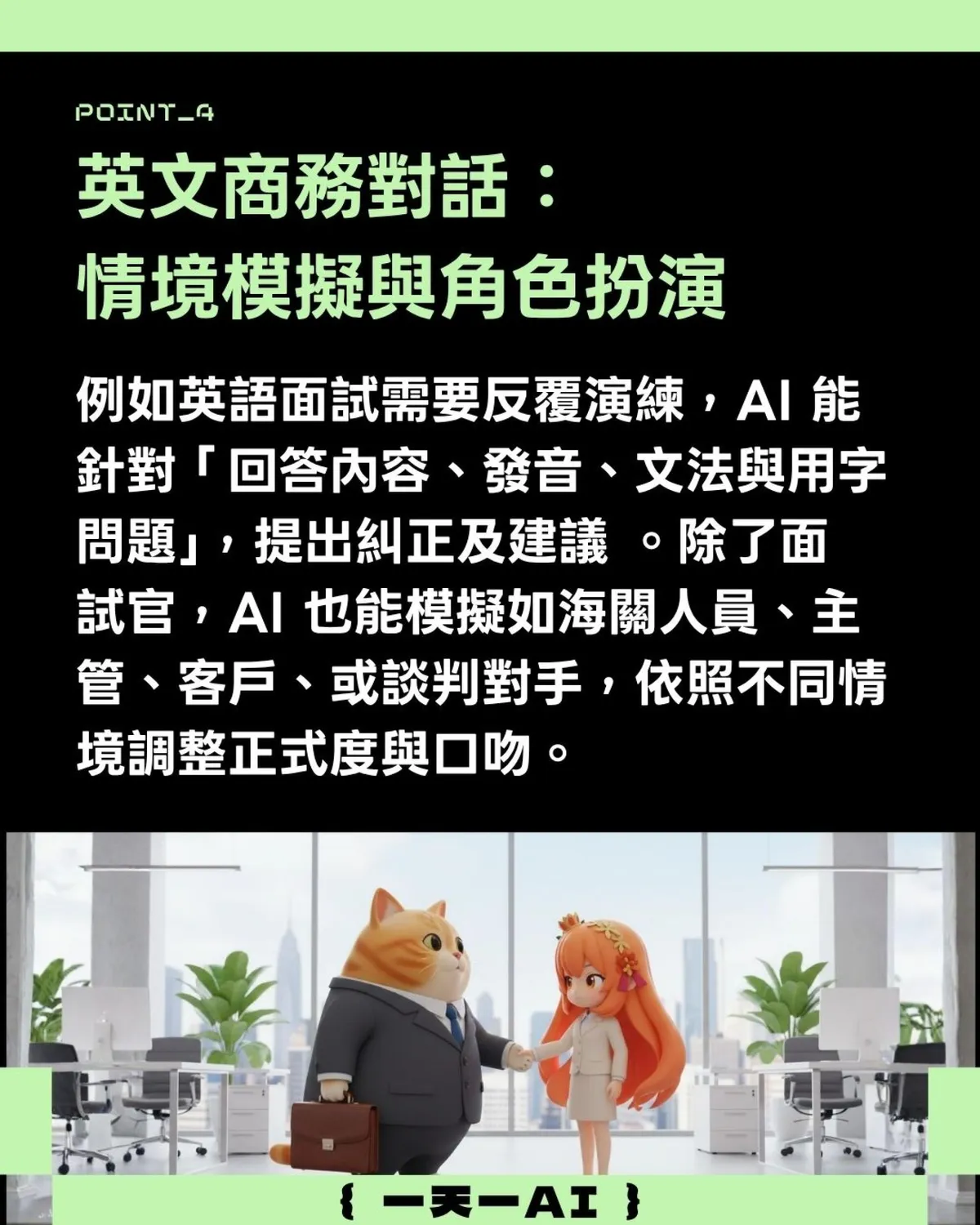 除了面試官,AI也能模擬如海關人員、主管、客戶、或談判對手,依照不同情境調整正式度與口吻。