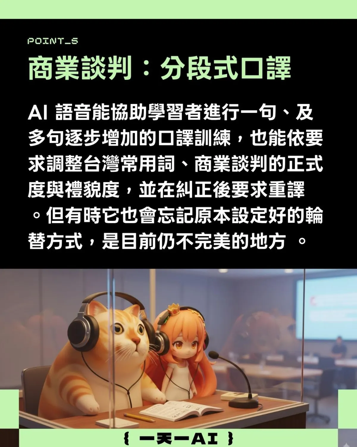 AI語音能協助學習者進行一句、及多句逐步增加的口譯訓練,也能依要求調整台灣常用詞、商業談判的正式度與禮貌度,並在糾正後要求重譯。但有時它也會忘記原本設定好的輪替方式,這是目前實用但仍不完美的地方 。