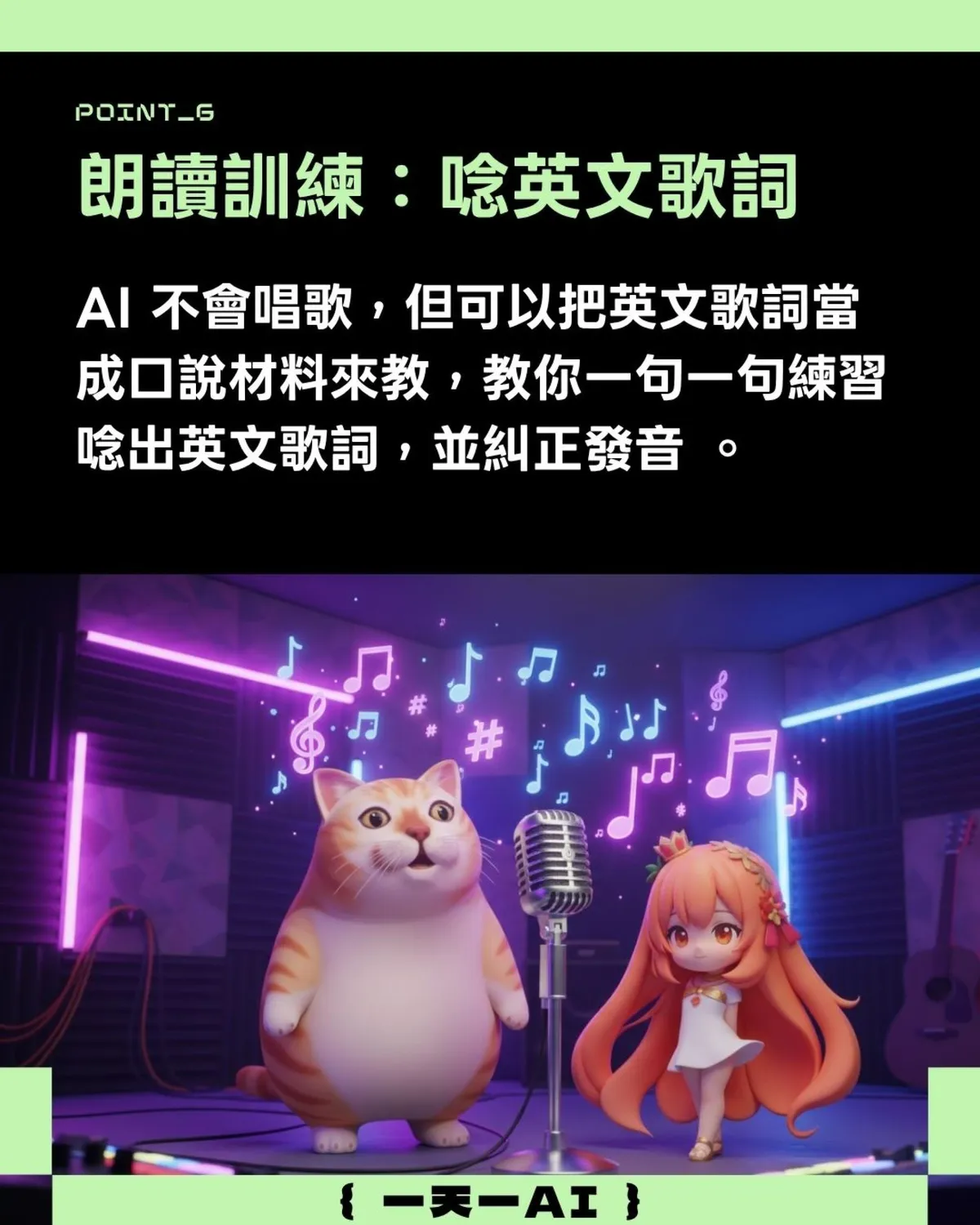 AI不會唱歌,但可以把英文歌詞當成口說材料來教,教你一句一句練習念出英文歌詞,並糾正發音。