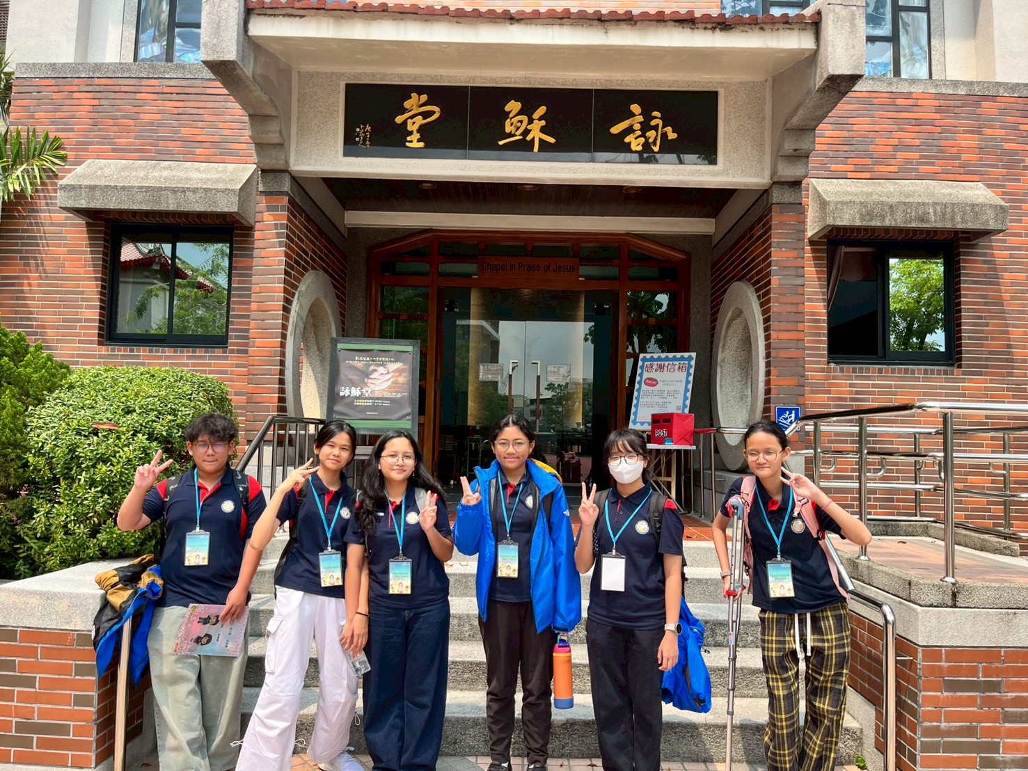 來訪學生在文藻東南亞學系學生陪同下進行分組校園導覽,於詠穌堂前留下交流紀念。 |