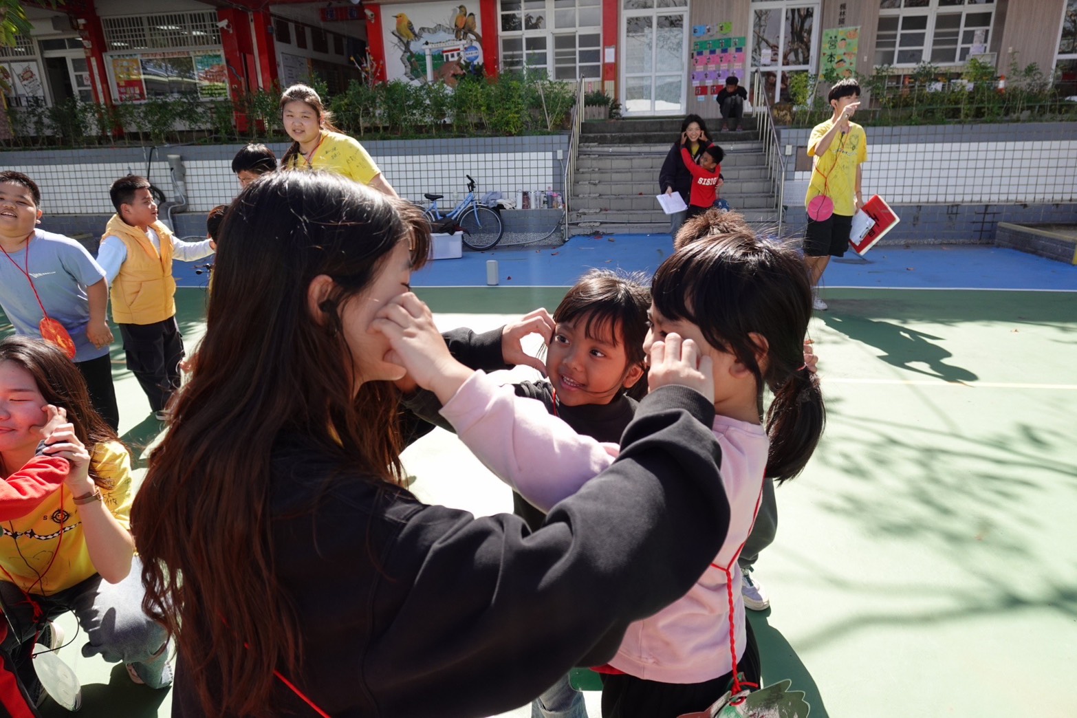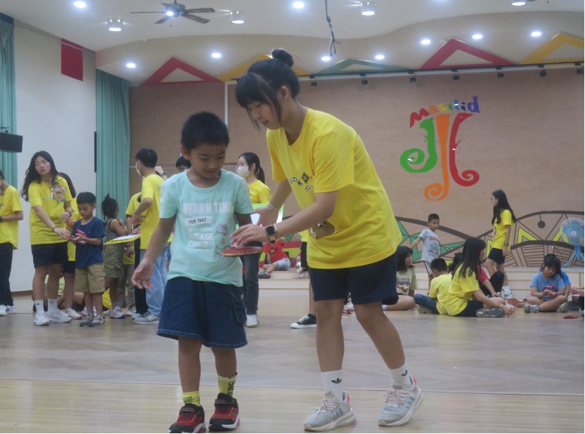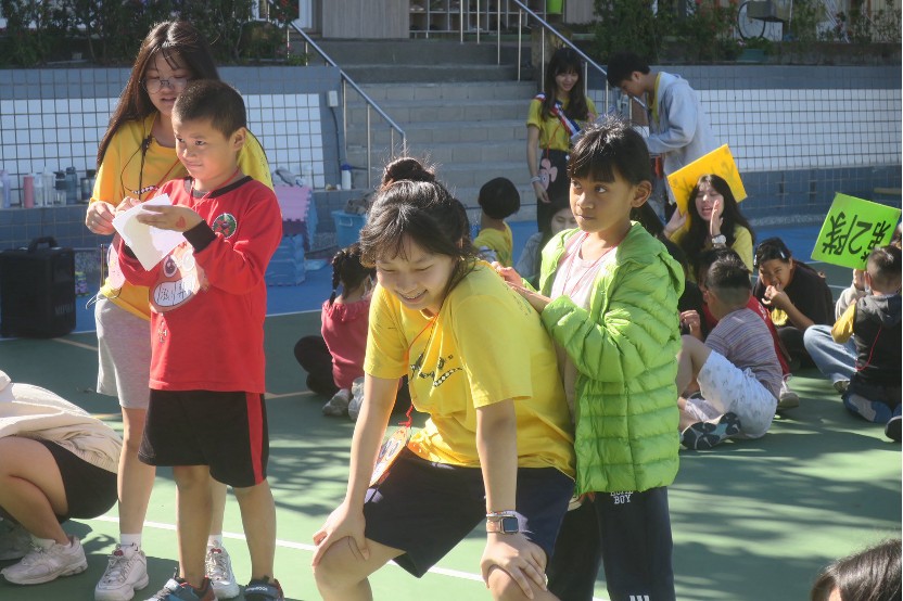 賈綵婕於營隊中陪伴小朋友參與大地遊戲、共同互動。 |
