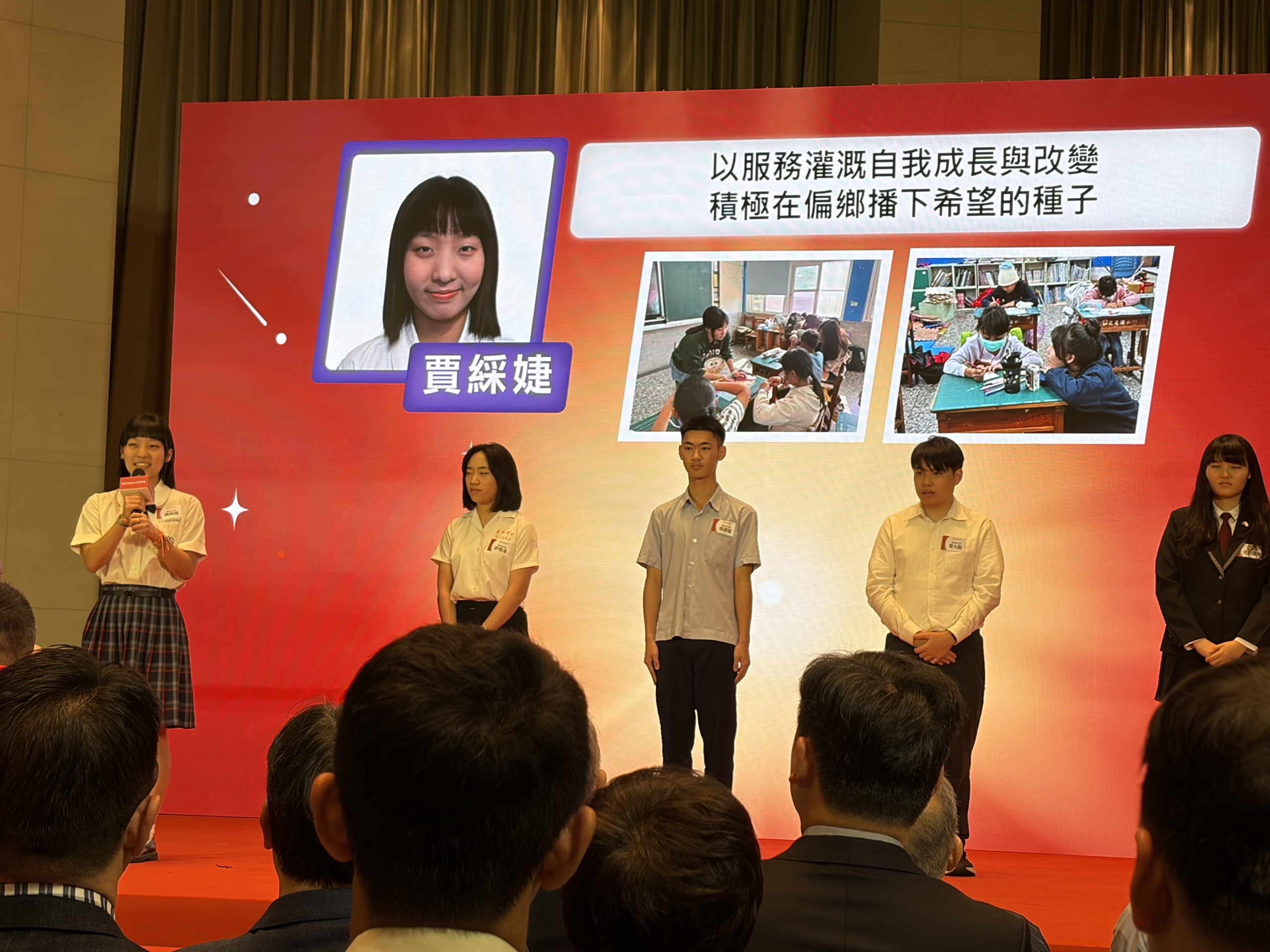 榮獲傑出志工獎的賈綵婕,自國小時期即開始參與志願服務,長期關注環境議題與偏鄉教育。進入文藻外大就讀後,她加入山地服務社,持續深入花蓮縣玉里鎮及屏東縣獅子鄉等地的國小,規劃英語生活營。她不僅積極參與教學,更投入營隊創新設計,例如結合原住民文化推出「原民日」課程,透過與校內原住民資源中心合作,帶領學童認識琉璃珠文化、傳統圍舞及族語,促進文化傳承與多元學習。