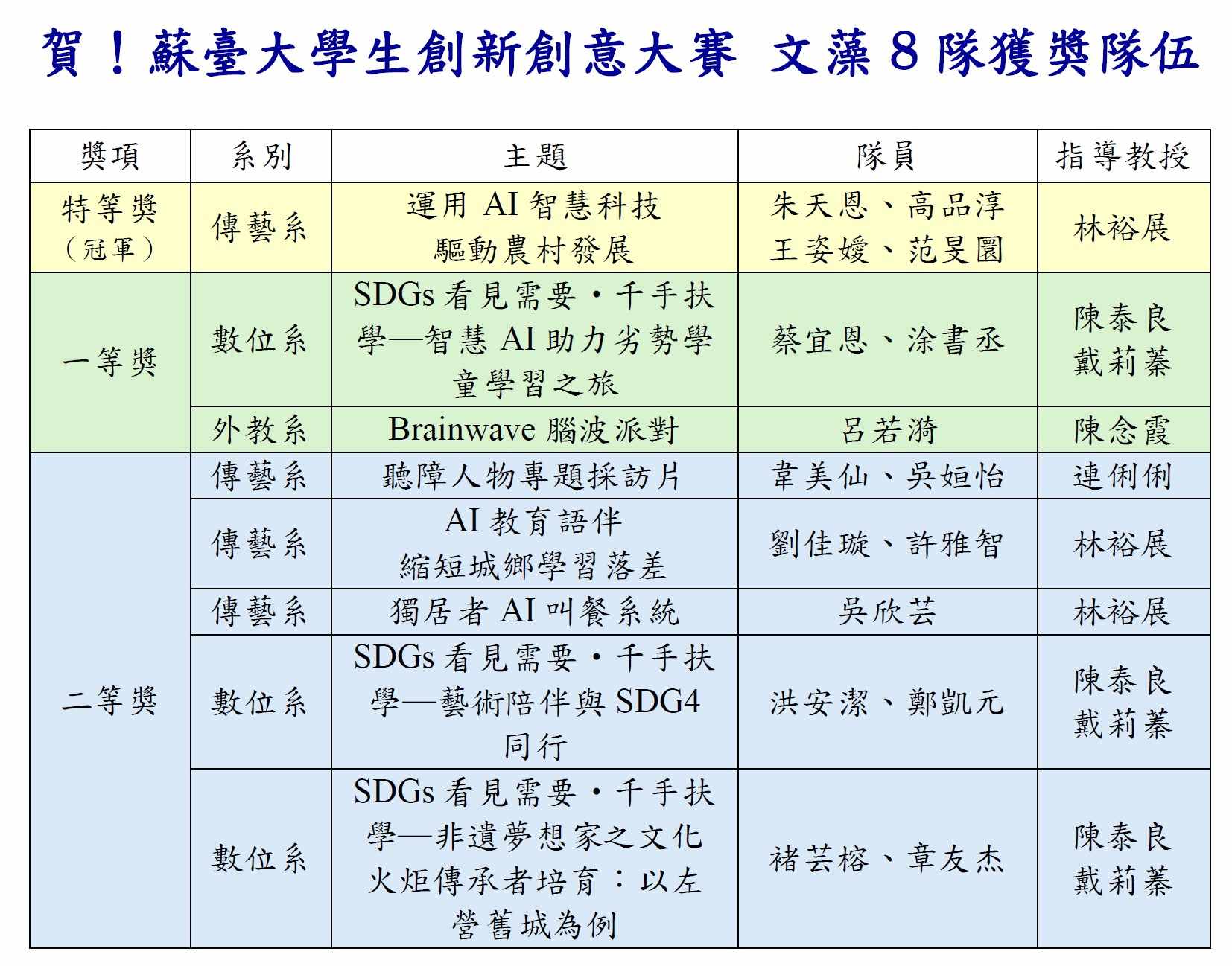 得獎團體/學生系級/姓名/教師 1組學生獲特等獎(冠軍)朱天恩、高品淳、王姿嬡、範紋旻圜,2組學生獲二等獎劉家璇、許雅智及吳欣芸。